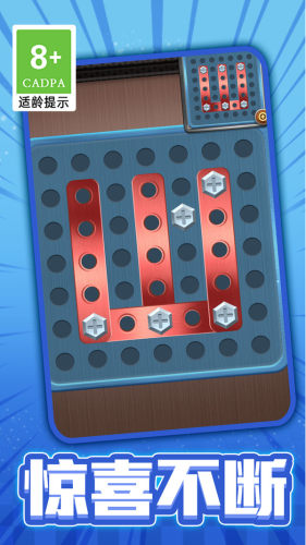 脑洞我做主安卓版是一款非常好玩的休闲解谜闯关游戏,玩家可以在这款游戏中享受到非常不错的解谜游戏体验,通过移动钉子来卸下铁板,游戏关卡一开始比较简单,玩家需要移动的钉子数量少,而可以移动的位置多,但是越到后面关卡就会越难,钉子数量不断增加,非常考验玩家的策略性。