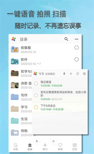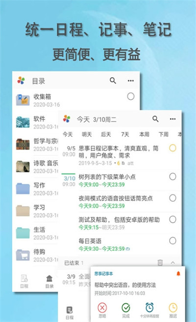 思事日程记事是一款专门记录自己平常生活的软件,可以把自己觉得比较重要的事情都放在软件上面记录下来,这样大家就可以直接更有计划的管理自己的行程,每天可以把重要的事情发布在上面,这样到点都会给你提醒。