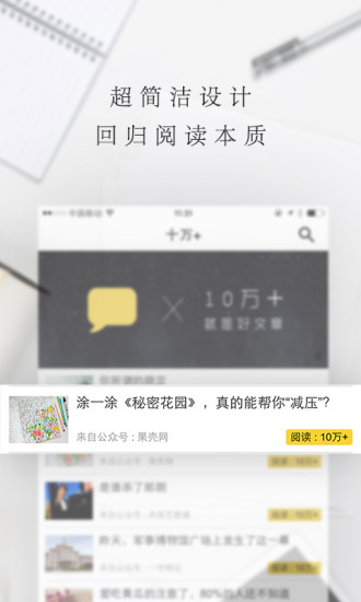 10万加app是一款为用户提供阅读服务的软件。用户只要下载10万加,就可以在里面发现和阅读到好的文章,感受不一样的视觉体验,在里面用户只需要静静的看文字,我们不会在这里插入无关重要的广告,给用户提供一个专业的阅读平台。操作方法简单便捷,只需动动手指,就可看到好的文章,还在等什么?赶快下载它吧