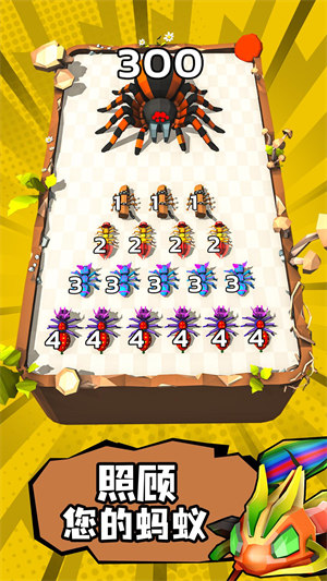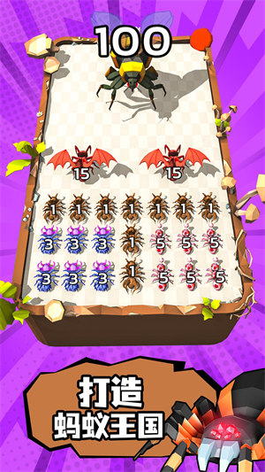 - 多种类型的蚂蚁士兵,包括小兵、工蚁、兵蚁等,每个种类的蚂蚁都有着不同的攻击和防御能力,玩家可以根据自己的需求和战术选择不同类型的蚂蚁。