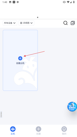 1、打开VMOS云手机应用,在云机页面点击创建云机的蓝色加号按钮。