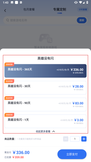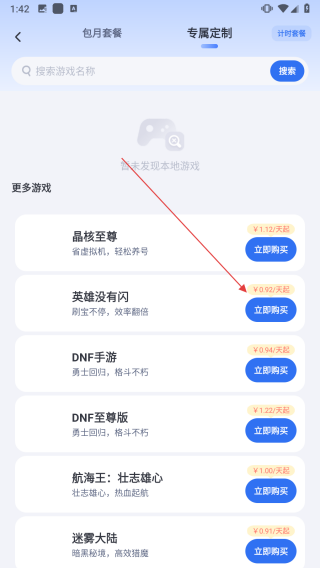 2、进入套餐选择页面后,找到目标游戏套餐,点击套餐右侧的立即购买按钮。