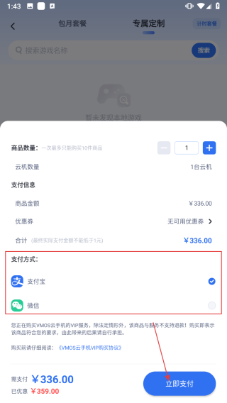 4、选好套餐后,确认商品数量、云机数量,选择支付方式,点击立即支付按钮完成付款。