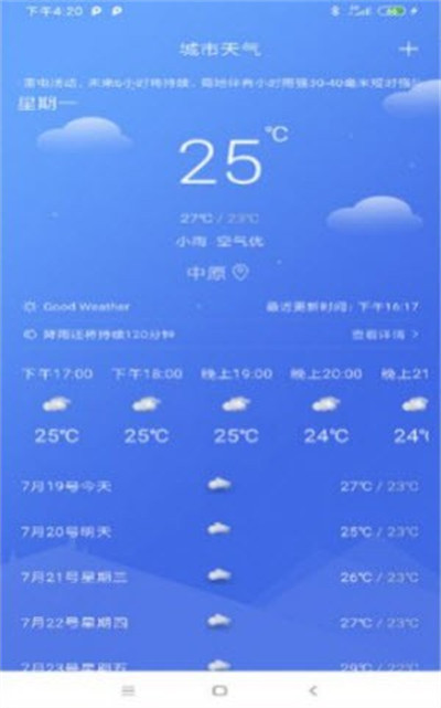怡和天气软件是一款可以添加多个城市天气情况的软件,可以在软件上面查询到天气遇到的数据,这里也能直接查询每天天气是否有恶劣天气的情况,这样大家可以更好的选择出门是否需要带装备,让自己看到更多情况,大家还可以获取未来一个月内的天气趋势,这样大家当月可以选择是否有时间出游,提前做好自己的规划。