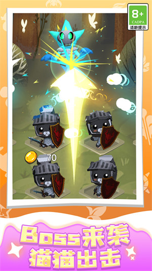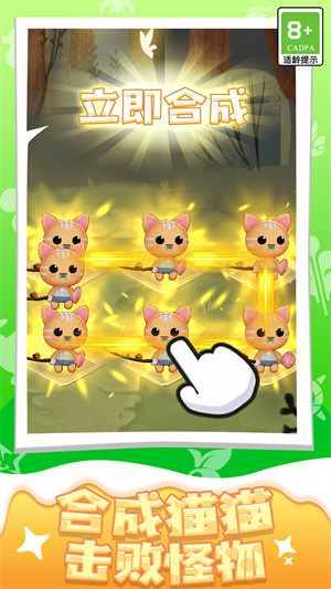 - 需要收集各种可爱的喵喵,每个喵喵都有着不同的属性和技能,可以组成一支强大的队伍,玩家可以通过合成、抽卡等方式获取新的喵喵,并提高已有喵喵的等级和属性。