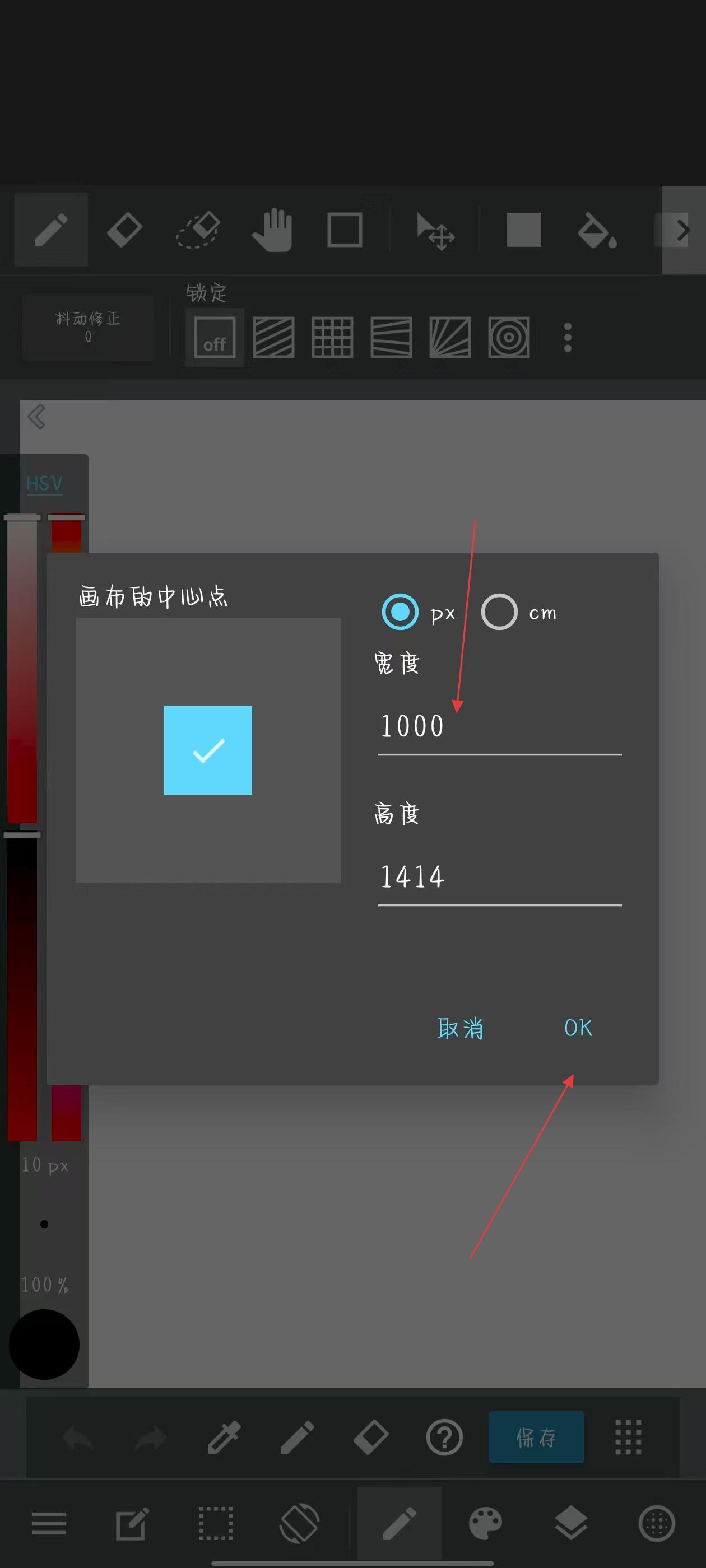 4、在画布尺寸设置窗口中,输入需要的宽度和高度数值,设置完成后点击OK按钮,即可完成画布大小的修改。