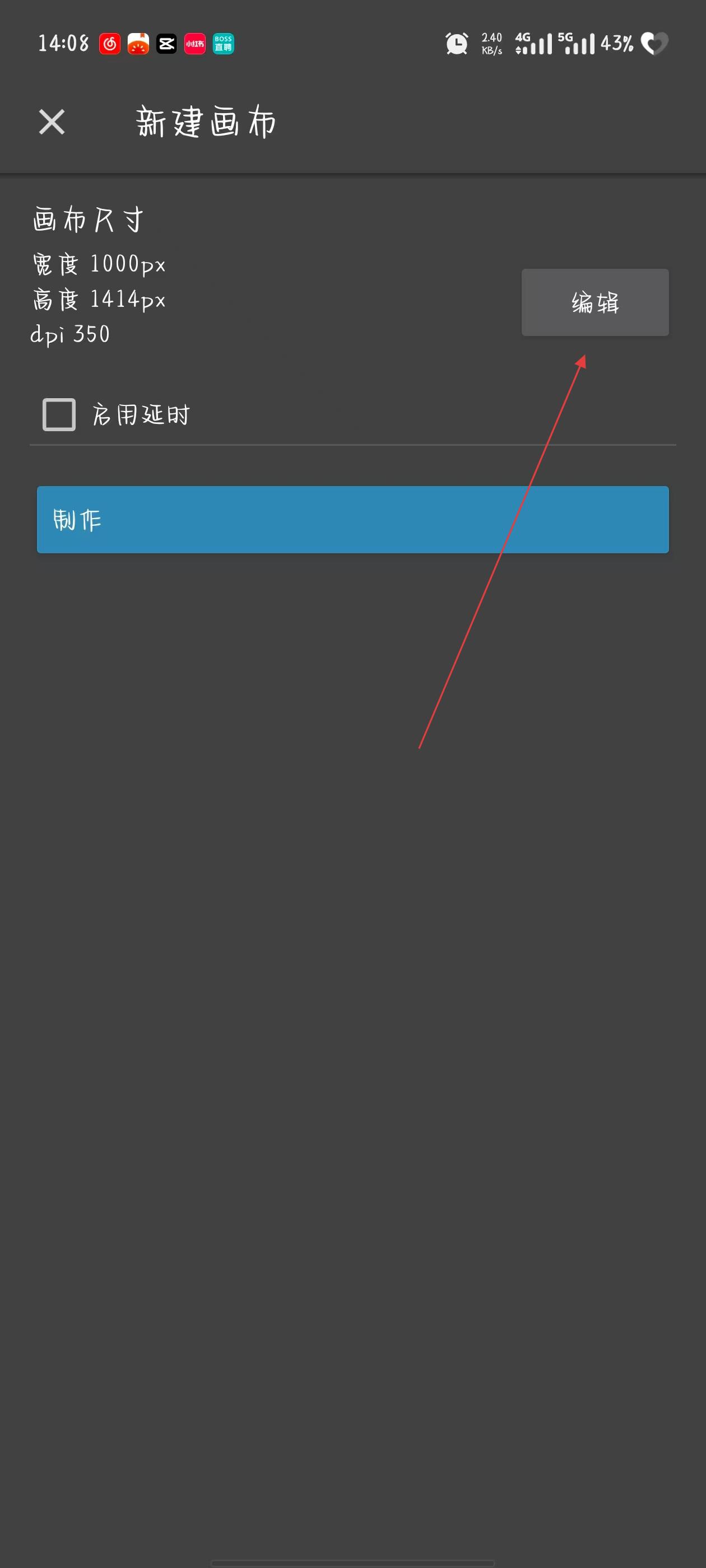 2、在新建画布设置页面,点击编辑按钮,可调整画布尺寸、dpi等参数,按需设置后返回。