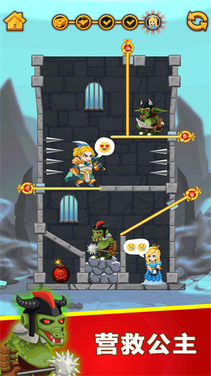 闯关营救小姐姐手机版是一款乐趣与挑战并存的益智解谜游戏,在这个游戏中,玩家扮演一名英雄,需要拯救被怪兽绑架的公主,并取回被盗宝藏。但是,在寻找公主的过程中,英雄将会面临各种危险的陷阱,包括熔岩管道、气体管道、有毒液体等等。