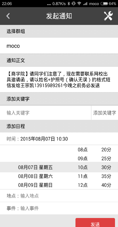 1.日程提醒功能:开会时间、上课时间、收作业时间……你可以将这些时间内嵌在发送的通知中,收到通知的人可以保存这些日程,并有提醒功能
