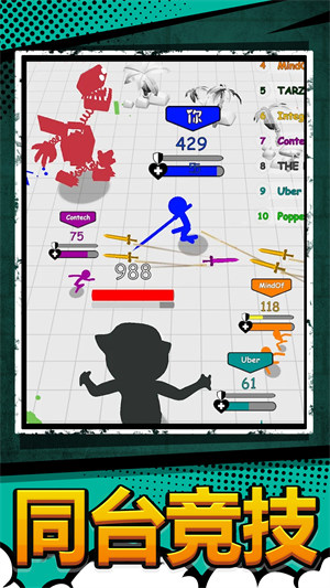 - 在竞技场模式里,你需要与其他玩家同台竞技,并遭遇各种各样的怪物僵尸BOSS,挑战越来越强大的敌人,你需要不断提升自己的实力和技能,火柴英雄就在这里诞生。