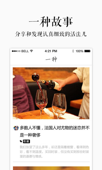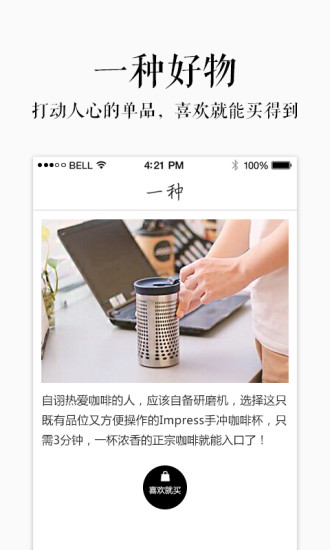 一种ios是款生活服务的软件。用户在这里可以享受到精致的生活状态,分享和发现身边一些人细致的活法儿,在这里,如果用户发现了一种好的商品,也可以立即购买,只要你喜欢就能让他成为你的商品。也可以随时随地与大家一起分享自己的生活感悟,有了一种,让你的生活从此与众不同。欢迎下载!