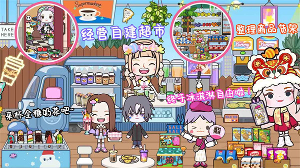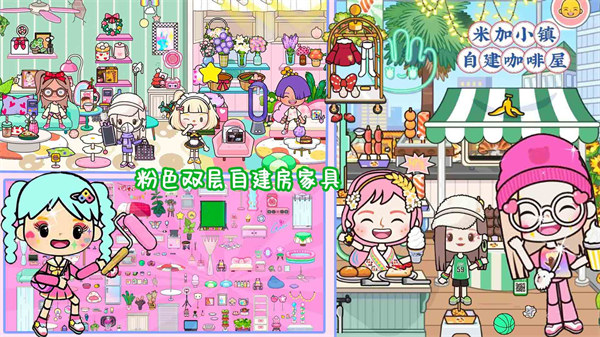 - 提供了丰富的服装、发型和妆容选择,让你自由定制自己的形象和风格,创作属于自己的故事,游戏中还有各种场景可供选择,如粉色双层自建房、自建咖啡屋等。