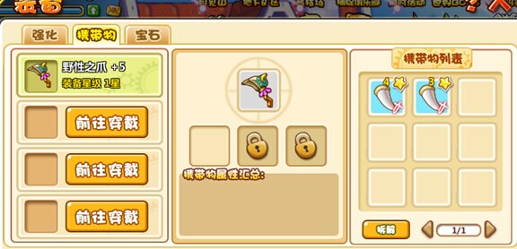 副本获得的携带物可以在这里装备上每件装备都有3孔,其中第一个自动打开后面2孔开启有2种方式