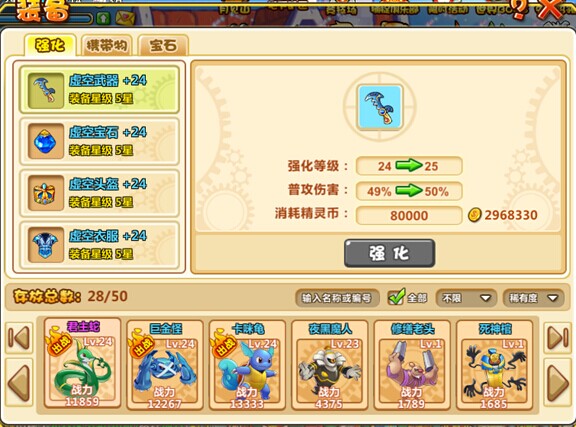 升星:4399小小精灵装备每5级,进行一次升星,升星需要消耗材料满足条件即可升星