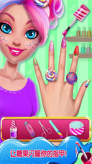 获得各种神奇的美妆工具,如彩虹糖屑做装饰、草莓红指甲油、小熊软糖贴纸等等,让你可以用最独特的手法和效果打造美妆,还有宝石工具,利用棒棒糖宝石设计出令人炫目的珠宝。