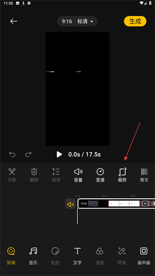 3、在剪辑界面的功能栏中,找到并点击裁剪的选项,打开裁剪操作面板。