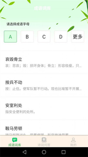 1、软件的界面非常的简单,操作起来的难度也是非常低,适合想要学习成语的人群使用。