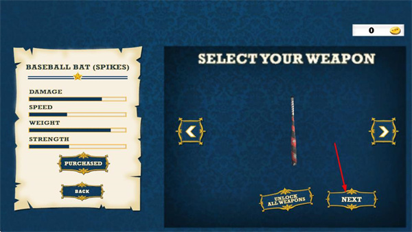 3、在武器选择页面,确认所选武器后,点击“NEXT”按钮推进游戏流程。