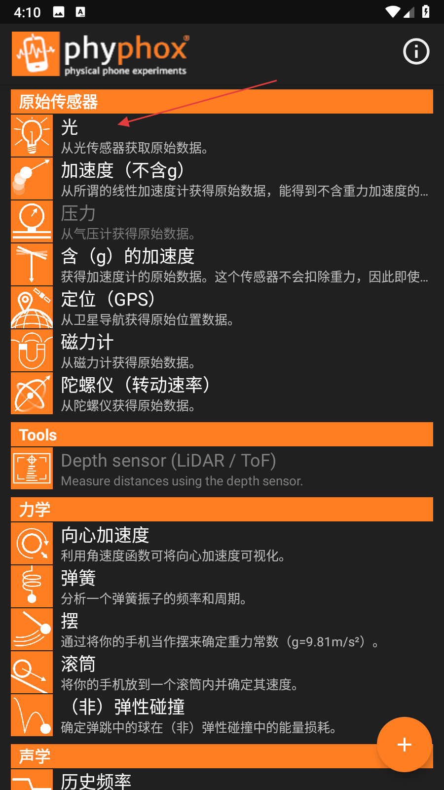 1、打开物理工坊应用,在传感器板块中选择要导出的实验,比如点击光选项,进入光传感器实验界面。