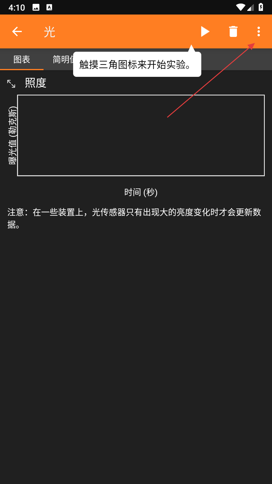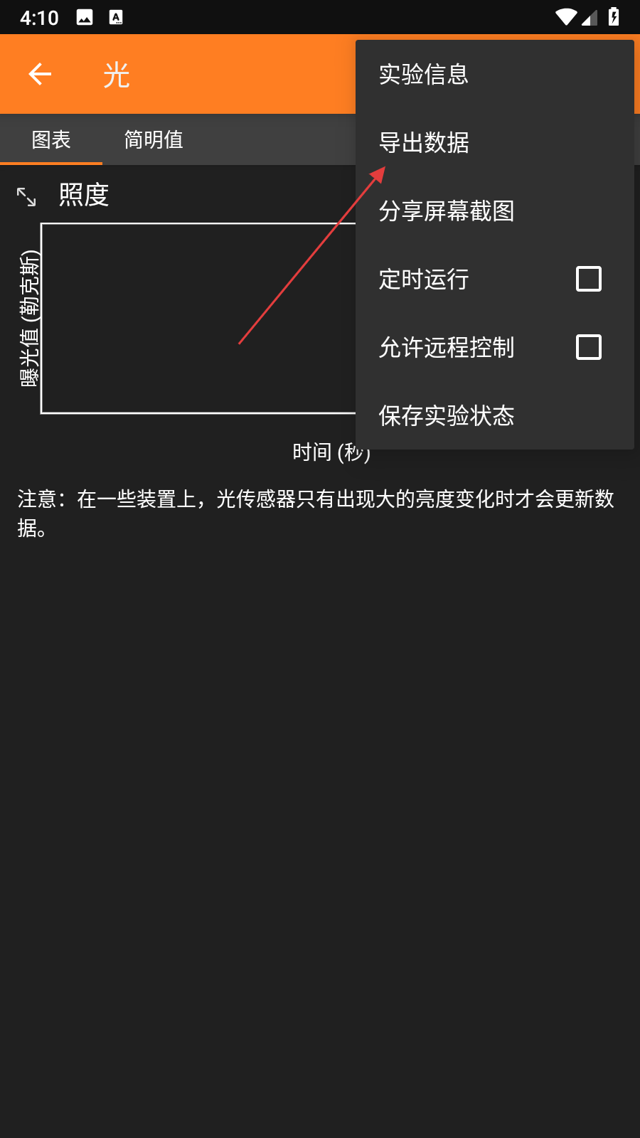 2、在光传感器实验界面右上角,点击三点图标,弹出功能菜单。