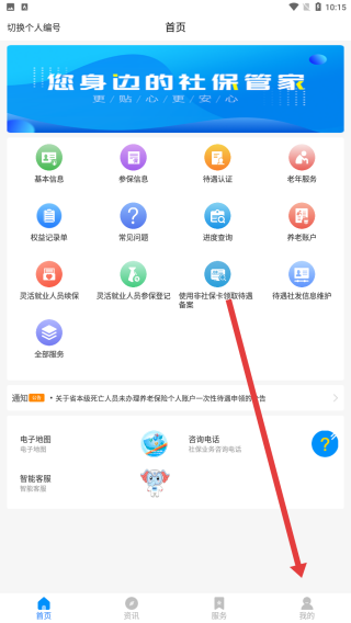 1、打开社保APP首页,点击底部导航栏的我的,进入个人中心界面,准备进行账号相关操作。