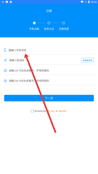 3、进入注册页面后,在首行输入框填写手机号码,为获取验证码、完成注册做准备。