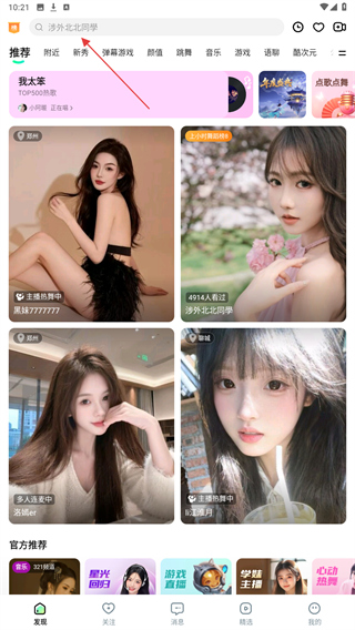 1、在酷狗直播的发现页面,点击顶部的搜索框。