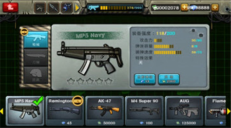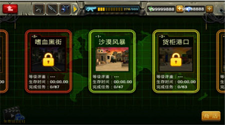 游戏修改金币及钞票为99998888,进入游戏即可获得,右上角全部都有显示哦,可以购买任意的武器和道具啦!!