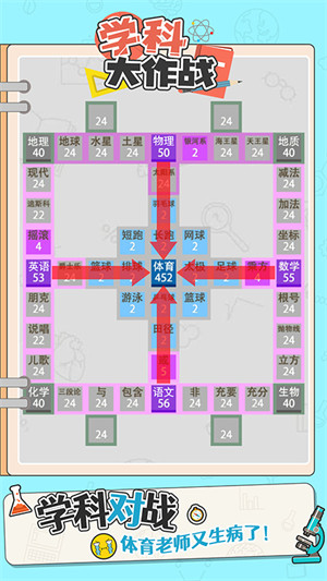 学科大作战是一款融入了学科元素的策略闯关游戏,游戏采用经典的策略游戏玩法,需要玩家通过调兵遣将攻占其他学科的领地以及保卫自己的领地,共有数十种学科兵种,每个兵种都有自己独特的属性和技能,扮演着不同的角色,比如数学兵种攻击力强,化学兵种能够制造炸弹等等。