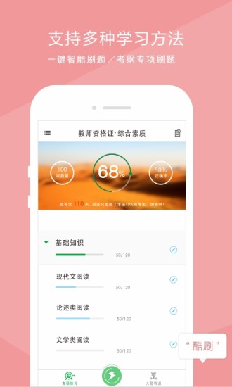 自学酷是一款免费自主学习的手机在线教育软件。帮助考生对教师资格证等考试进行快速复习通关。通过互联网思维、参与式设计、迭代微创新打造超一流精品。自学酷app可以帮助考生对教师资格证等考试进行快速复习通关。目前已上线“教师资格证” 包含“选择题”“主观题”“考纲知识树”“快速智能练习”“备考进度”等考试和功能。让学习变得更简单、更有趣、更时尚、更智能。