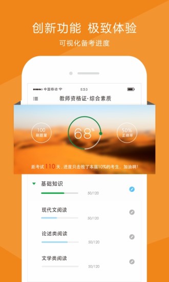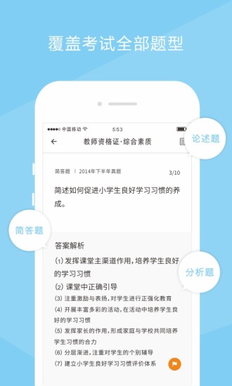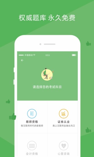 职业考试第一助手。帮助考生对教师资格证等考试进行快速复习通关。通过互联网思维、参与式设计、迭代微创新打造超一流精品。目前已上线“教师资格证”“选择题”“主观题”“考纲知识树”“快速智能练习”“备考进度”等考试和功能。