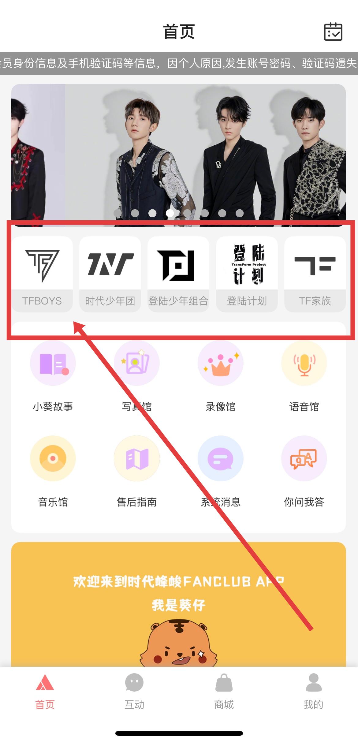 1、打开时代峰峻FANCLUB软件,在首页找到想要加入的组合图标,点击组合图标进入。