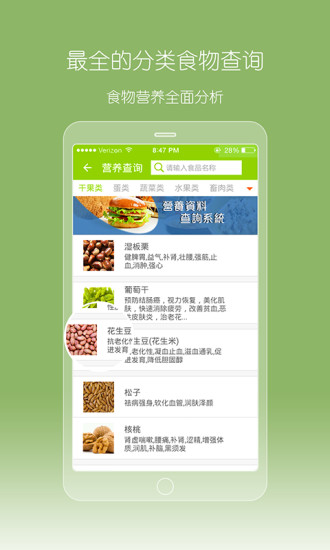 营养查询使您第一时间掌握营养成分及食物禁忌。