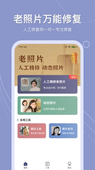 老照片万能修复是一款非常神奇的照片处理工具,拥有人工精修老照片,还有照片上色和动态老照片制作功能,能够高度还原人物面貌,适合多人群使用,可以随时添加照片处理。