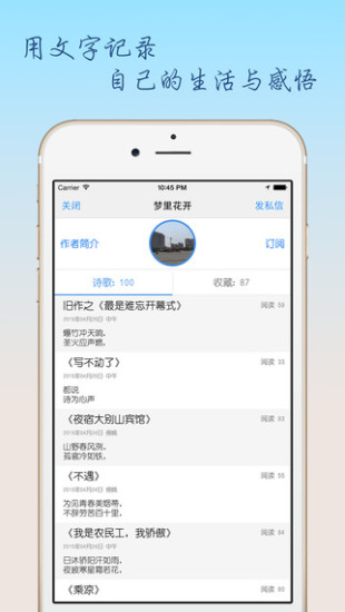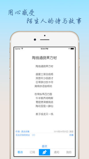 陌生人的诗,2015年最文艺最有心意的社交应用。只要你热爱写作、热爱文字,你也可以成为诗人。我,诚邀你和我一起徜徉在文字的世界里,感受一字一句所带来的魔力。