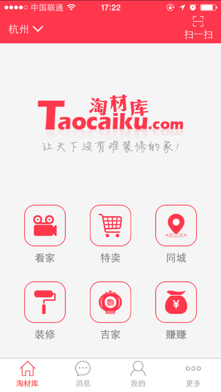 淘材库是国内首屈一指的集家装资讯、电子商务、线下体验为一体的综合性O2O家装服务平台。通过手机客户端,业主可以方便快捷的找到自己需要的装修建材,查询最新特卖的优质商品,并与商家直接沟通,拥有账户式管理中心。