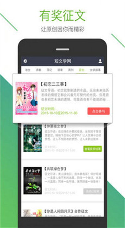 短文学app是一款专门自己短文的软件,任何时间有突然的想法都可以在软件上面记录,可以自己生成更加专业的短片文章,这样锻炼自己的文笔非常简单,创作更多原创的商品,直接点击投稿很容易被报社的工作人员找到,平台每天都会推送一些已经中奖的用户,参与这样的活动,增加自己的写作能力。
