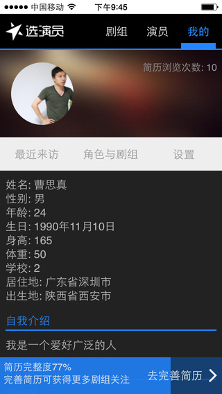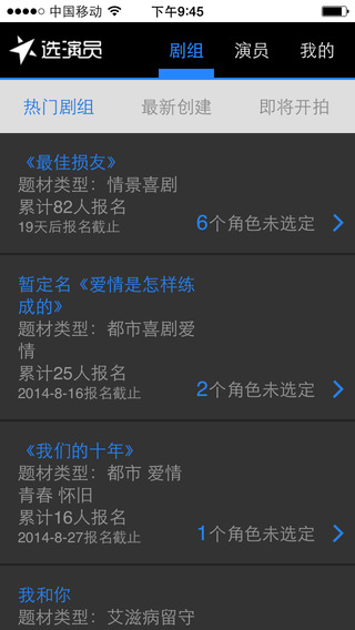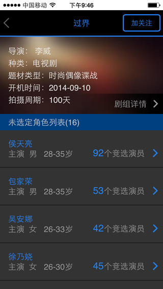 选演员iPhone版是一款将演员和剧组对接的软件,当剧组需要演员的时候,可以到选演员上看一看,也许很快就能找到适合的人,同时这里也有许多剧组的信息,作为艺人的你千万不要错过这些信息哟!