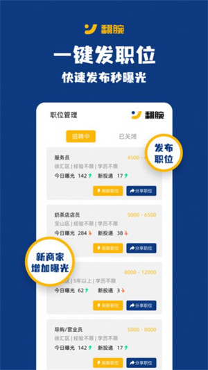 翻腕软件是一款非常好用且便捷的手机招聘app,这款软件的主要功能是帮助门店和商家发布招工信息,以便于吸引更多的求职者,这款软件可以通过发布招工信息、筛选和联系求职者等多种方式来进行招工管理。