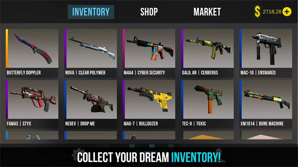 csgo皮肤开箱模拟器是一款专门针对csgo手游开发的皮肤开箱模拟器,玩家可以在这个小游戏中感受开箱时肾上腺素飙升的快感,同时游戏中还有超多稀有的皮肤等待着玩家的收集,不断的进行开箱,收集皮肤吧!