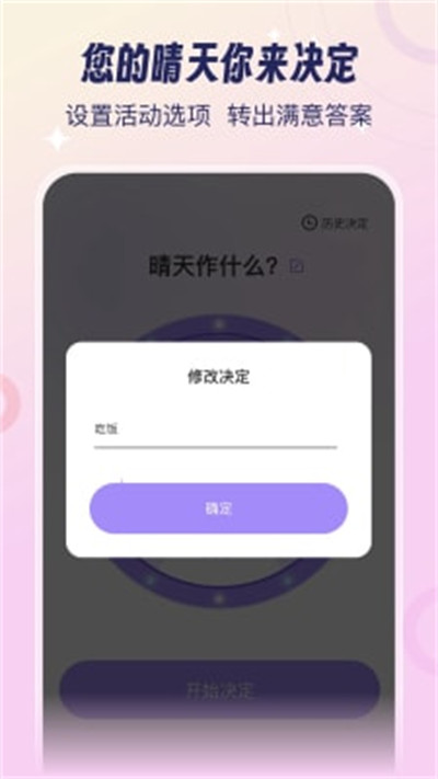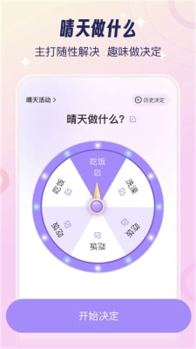 今日晴天软件是一款专门给有选择困难症用户打造的一款软件,这样的方式非常方便,让更多用户可以解决自己的困难,还能选择一些自己比较喜欢的事物做出自己的选择,这里的所有选择都是可以随机选择的,也能让你看清最适合自己的选择。