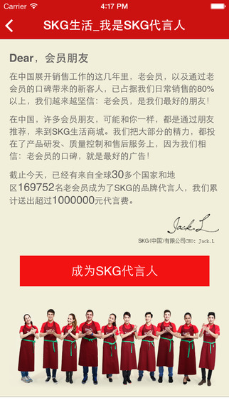 5.新增了“请你代言”模块,赶快来成为我们的代言人,邀请你的亲朋好友享受SKG生活的优惠吧