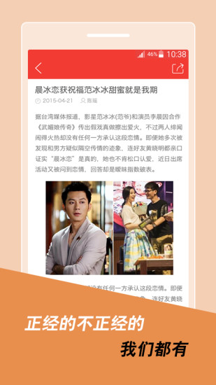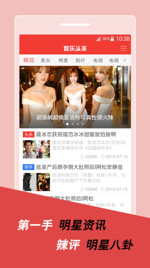 娱乐头条是一款喜欢娱乐八卦的朋友们打造的手机客户端软件,让你随时随地享受最新娱乐新闻和八卦事件,以满足你的好奇心,喜欢就尝试下载吧!