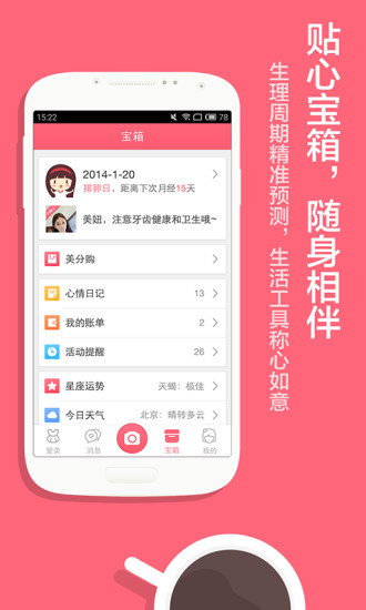 谁说不来大姨妈就不需要经期助手?高压痘、经前痛、忙碌肥、情绪瘦、孕前准备、孕后休养、哪一个不是姐妹的生活之重。美荔的大姨妈经期工具帮你追踪身体状况,准确判断生理健康和预测大姨妈。更有贴心的记账和日记小工具方便你的生活!