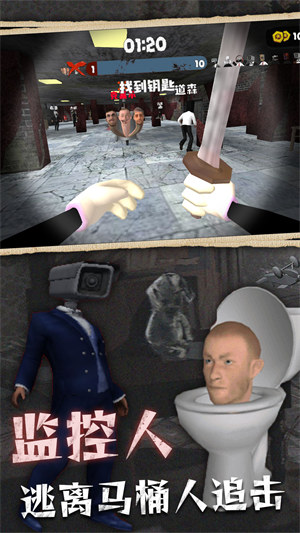 * 作为监控人,需要尽快逃离马桶人的追击,找到出口并解开各种谜题,顺利的出逃。