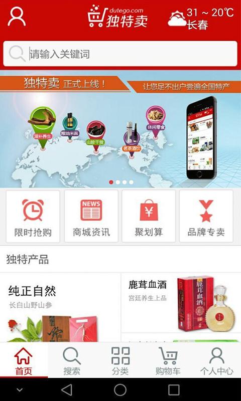 独特卖,是一款手机购物软件。集商品浏览、购买、搜索、支付、物流查询、便民工具等功能于一体。汇集全国各地名优独特产,包括馈赠佳品,有机食品,保健滋补,健康饮品,休闲食品的需求功能软件,帮助您在手机上随时、随地、随心的网购。