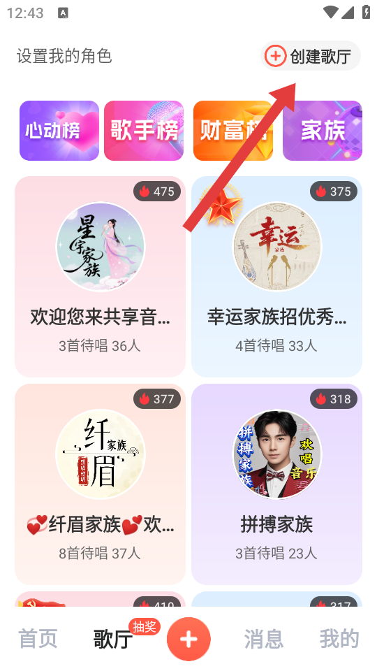 2、在歌厅的页面,点击右上角的创建歌厅按钮,触发创建流程。
