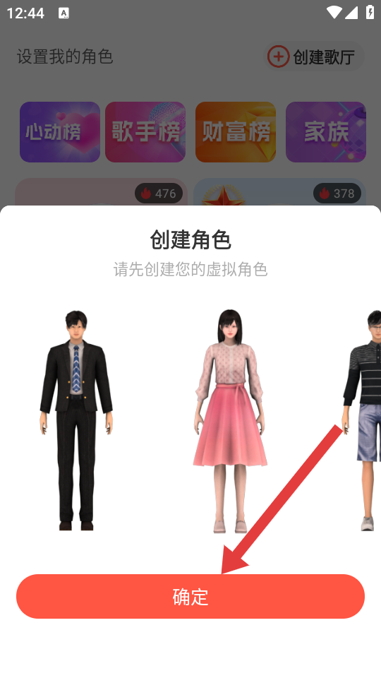 4、在创建歌厅界面,选择歌厅类型后,点击底部确定按钮,即可完成歌厅创建。