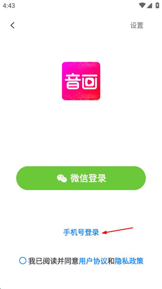 2、进入登录页面,看到音画标识及登录选项,选择手机号登录方式推进流程。