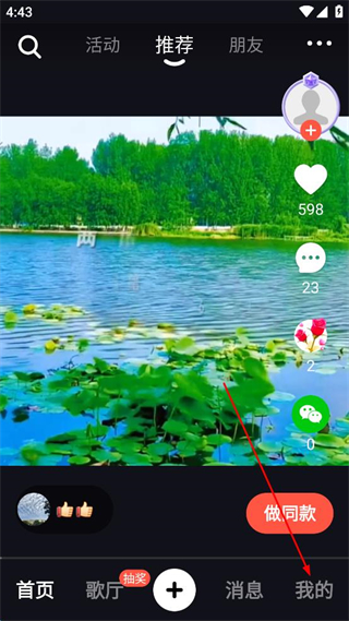 1、打开音画应用推荐页面,查看内容互动数据,点击底部导航栏的我的选项。